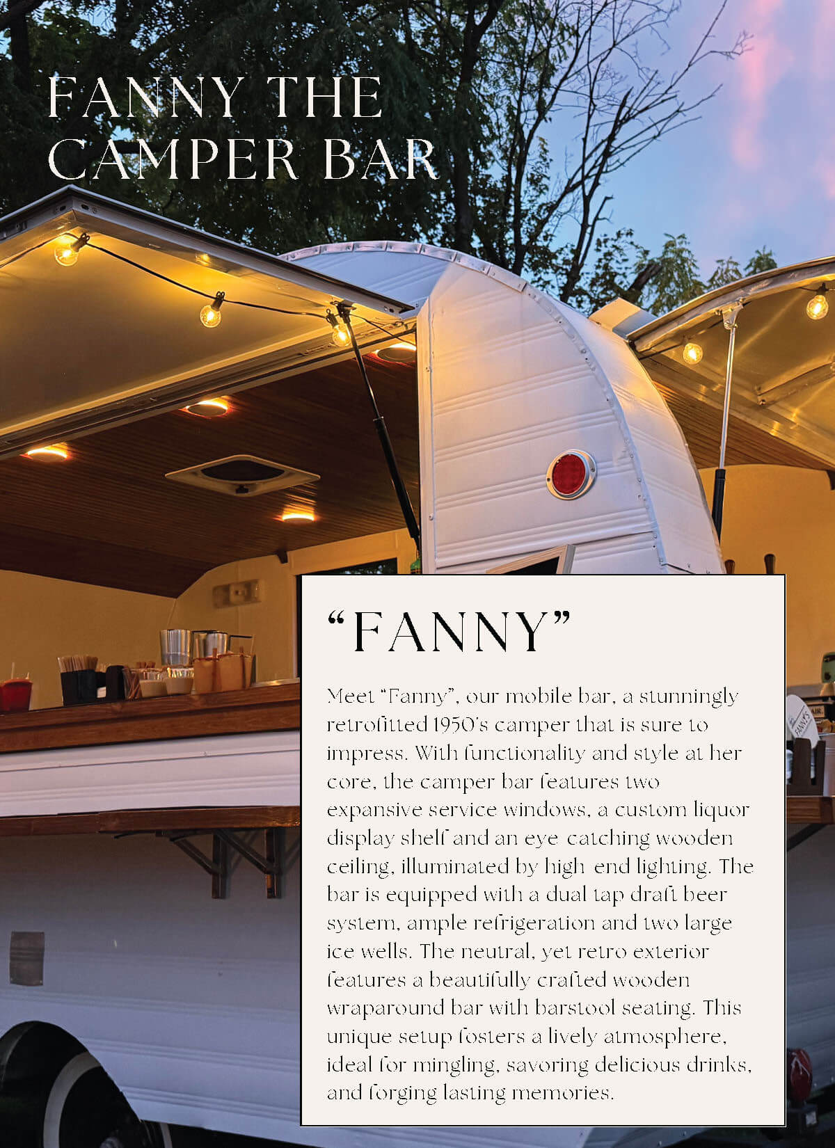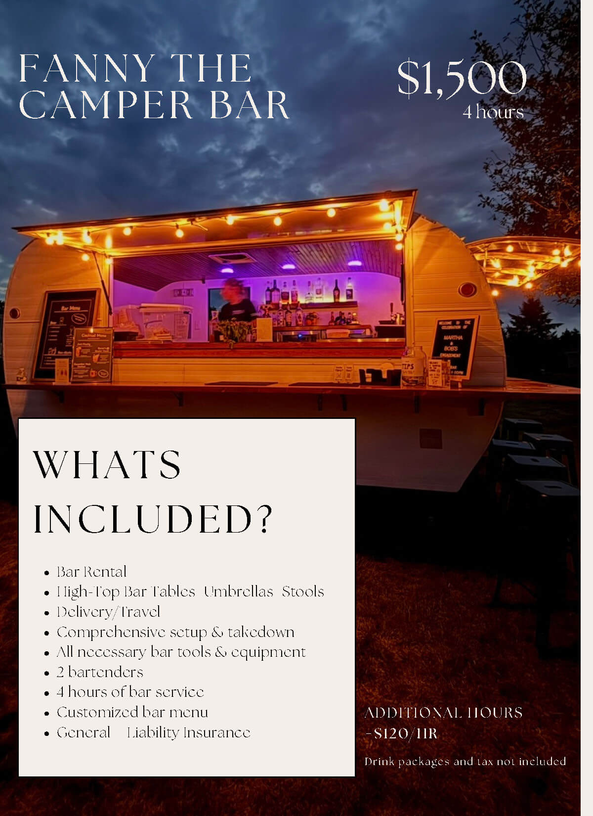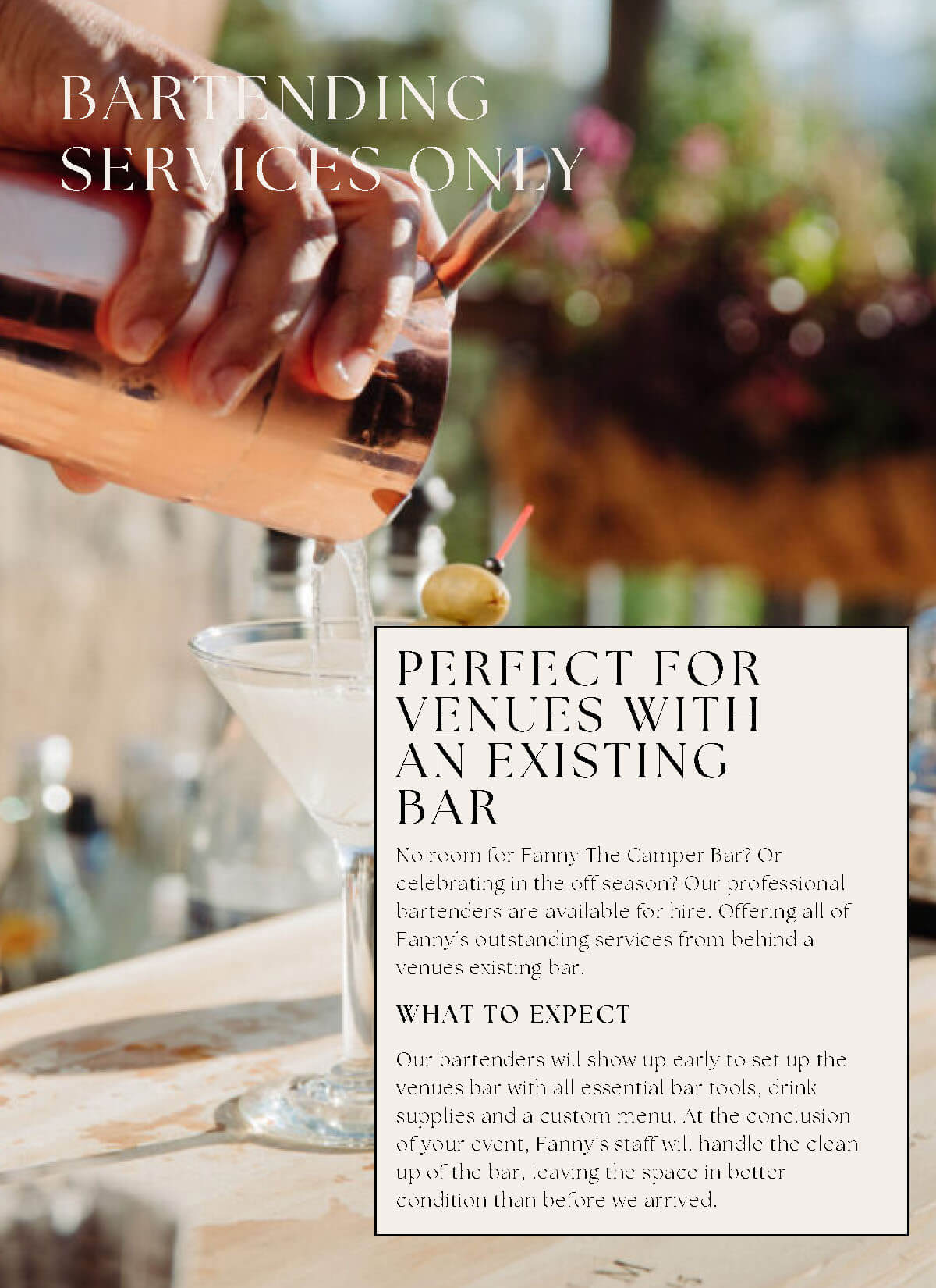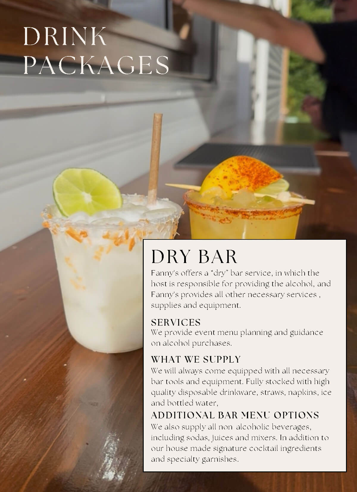 Fanny’s Mobile Bar & Bartending Pricing & Packages Use the buttons below to skip to the desired section: Meet Fanny Mobile Bar Pricing Bartending Only Drink Packages Supplemental Staff Ready to party? Contact Us Name Email Address Phone Date of Event Location of Event Type of Event Type of EventWeddingShowerBirthdayAnniversaryOther Message Submit